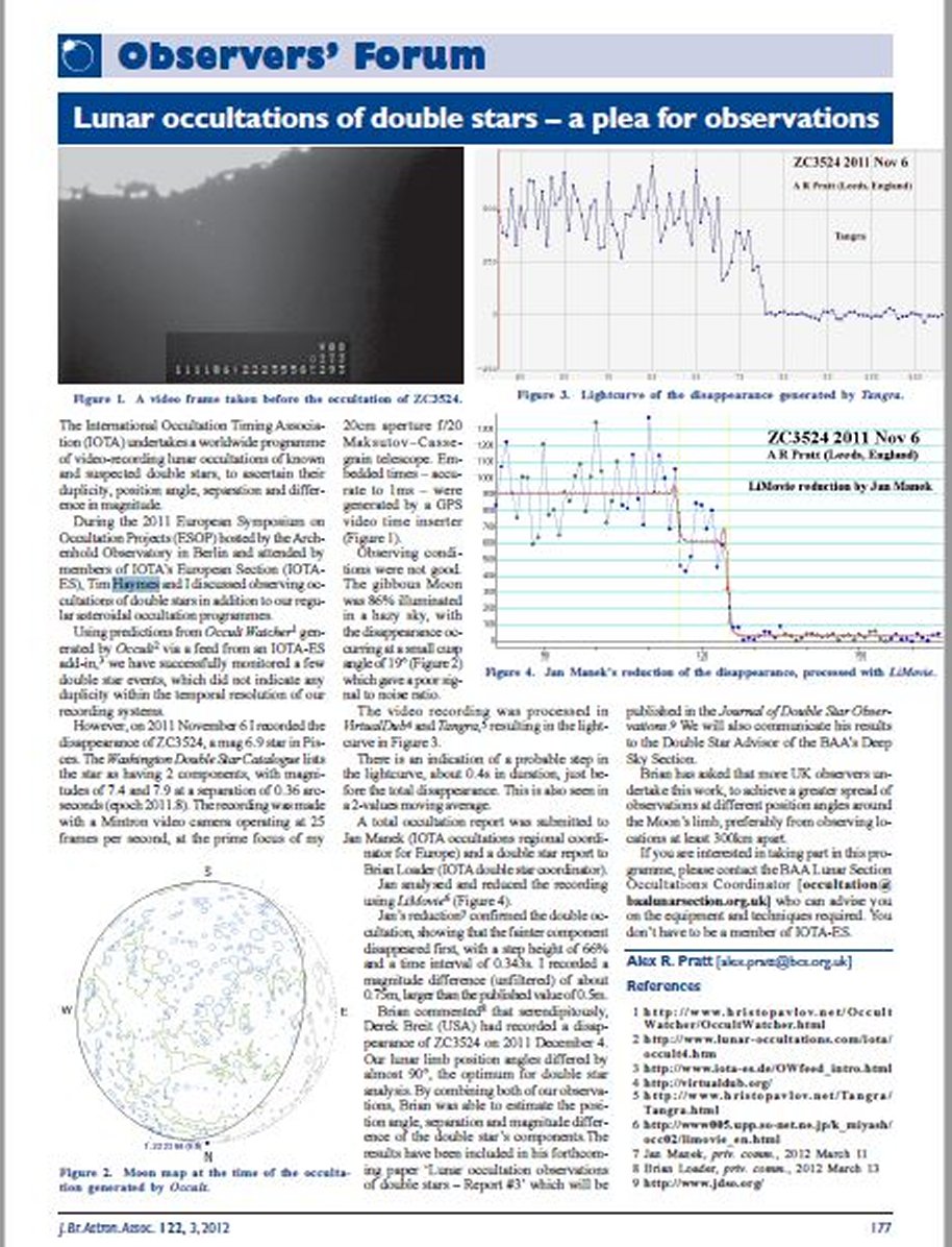 Lunar Occultation of double stars - a plea for observes, A.R Pratt - JBAA 2012 June p177, Vol. 122 No.3