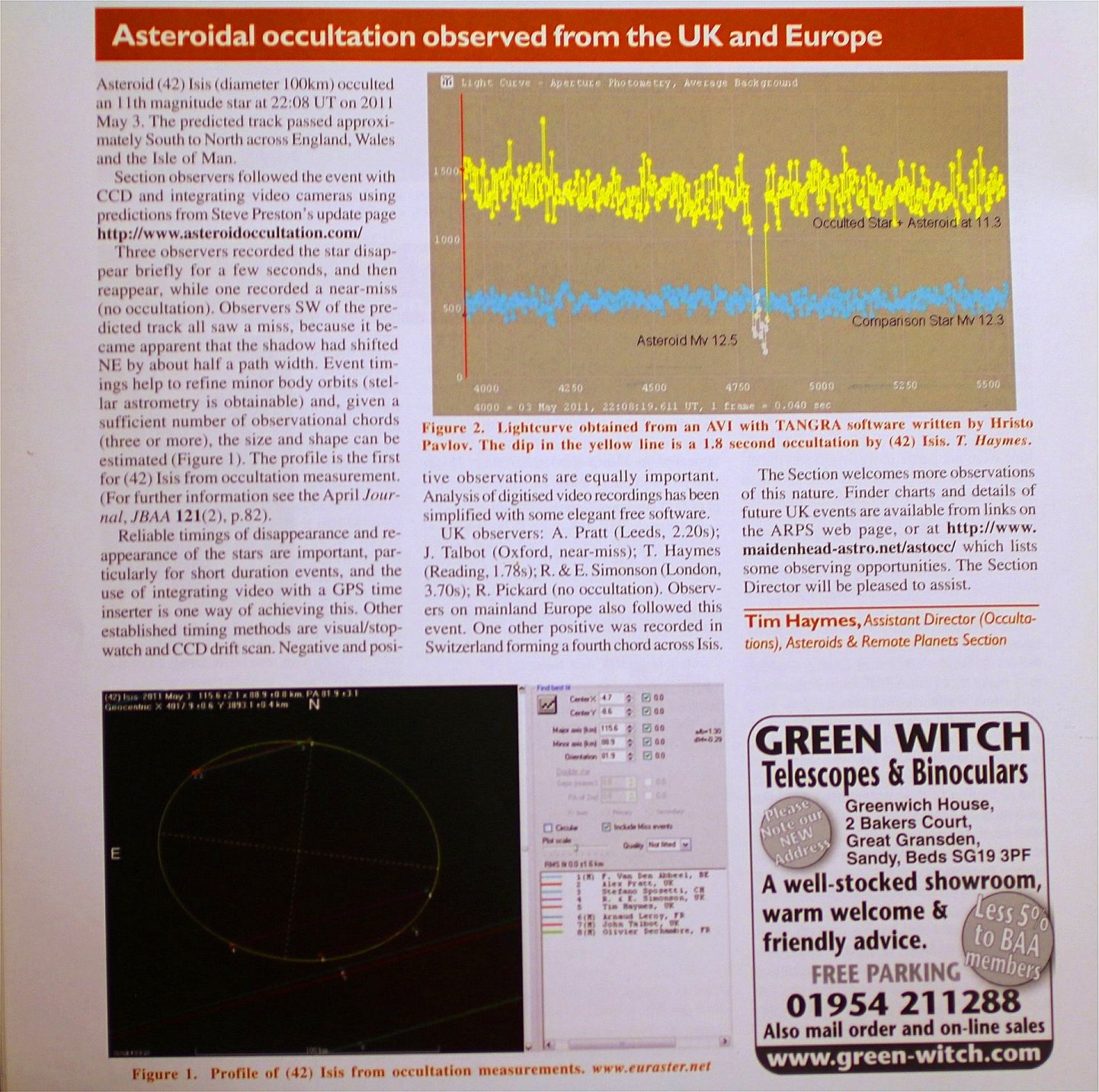 - Asteroid (42) Isis occulted a 11th mag star on May 3rd.