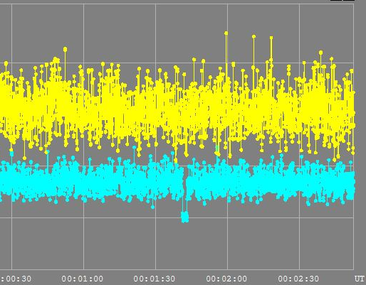 Fig-4 Example of a light curve with a short duration disappearance (in blue) obtained with Tangra software. The yellow line is a brighter comparison star